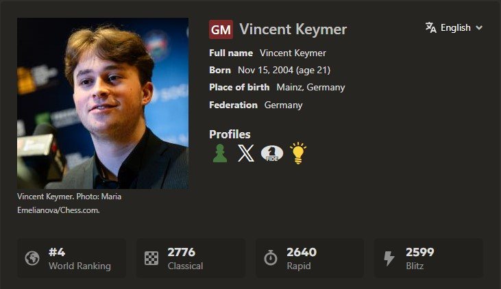 Vincent Keymer is a German chess grandmaster and one of the most promising young talents in the world. Born on November 15, 2004, he became the youngest German GM in history and quickly rose to compete among elite players on the global stage. Known for his deep strategic understanding and calm, precise style, Vincent continues to represent Germany in major international events, earning recognition as one of the leading figures of modern chess.